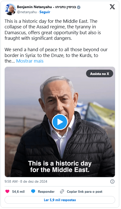Em um vídeo divulgado no seu perfil do Twitter/X, Netanyahu descreveu o governo de Assad como um “elo central no eixo do mal do Irã”.