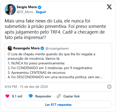 “Mais uma fake news do Lula; ele nunca foi submetido à prisão preventiva. Foi preso somente após julgamento pelo TRF4. Cadê a checagem de fato pela imprensa!?”, afirmou Moro em uma postagem no Twitter/X, ao compartilhar publicação de sua mulher, a deputada federal Rosangela Moro (União-SP).