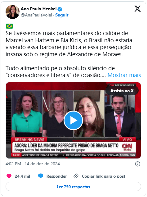 “Aí, a gente fica assistindo a boa parte da mídia tentando fingir que está tudo bem, que vivemos em uma democracia maravilhosa”, acrescentou a deputada. “Não tem democracia. Tem tirania, tem censura. Todos os dias vemos julgamentos onde querem censurar e calar parlamentares, parlamentares sendo indiciados por falas na tribuna. Como eu vou me preocupar com ‘kids pretos’, com minuta? É uma palhaçada tudo isso.”