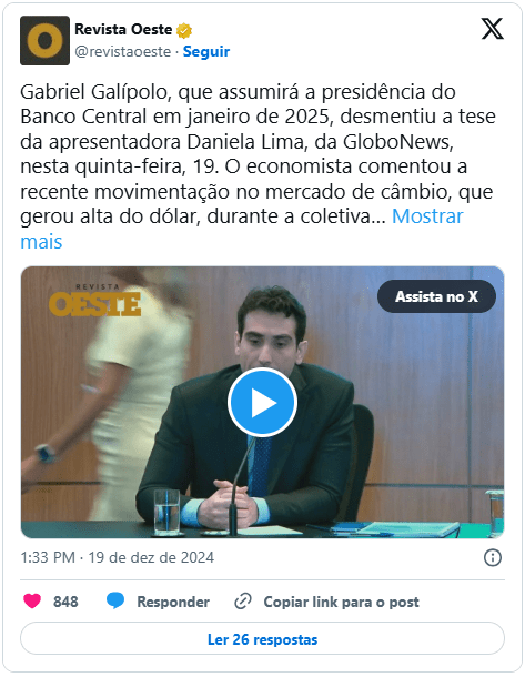 Gabriel Galípolo, que assumirá a presidência do Banco Central (BC) em janeiro de 2025, desmentiu a tese da jornalista Daniela Lima, da GloboNews, nesta quinta-feira, 19. O economista comentou a recente movimentação no mercado de câmbio, que gerou alta do dólar, durante a coletiva do relatório de inflação do quarto trimestre, em Brasília.