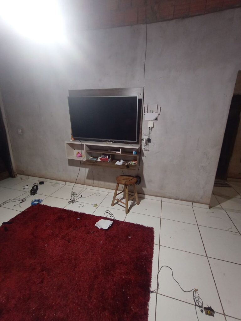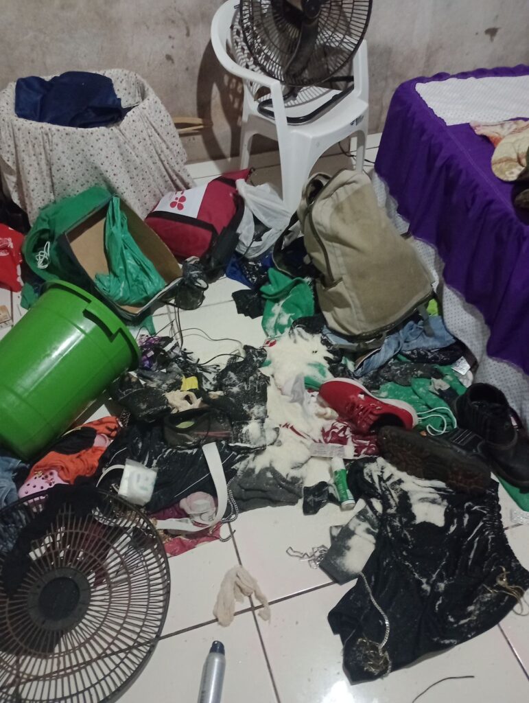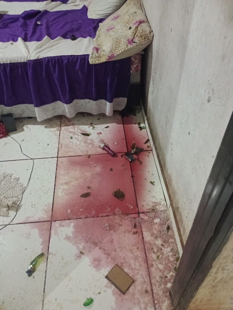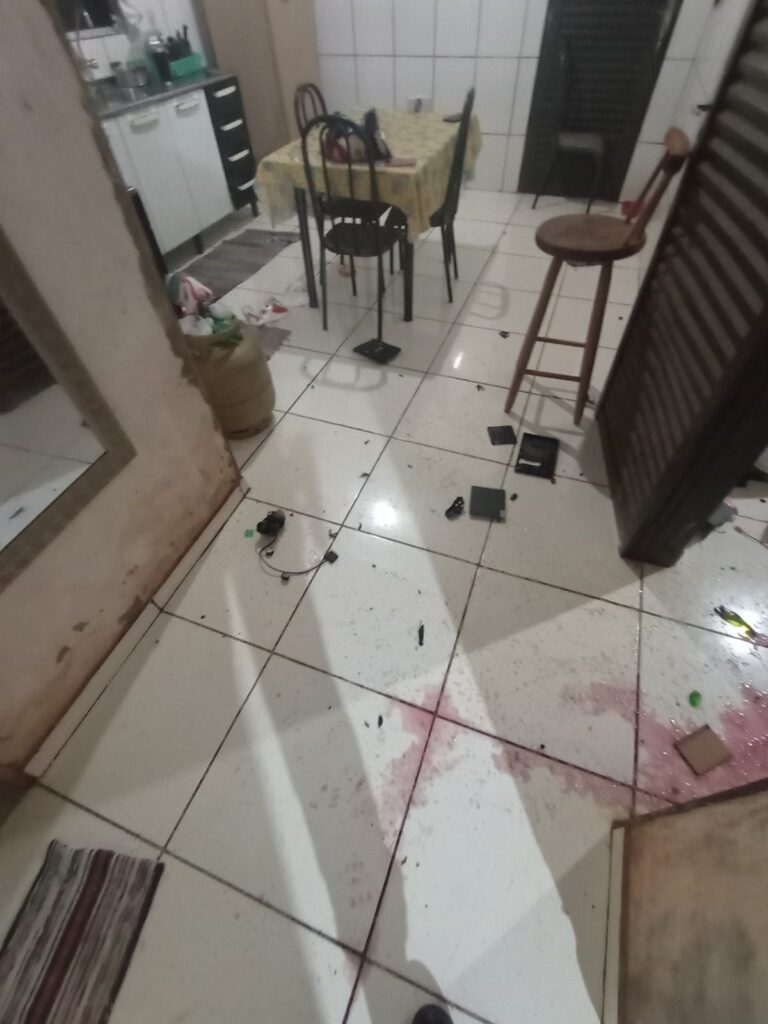 Dentro do imóvel, o cenário encontrado confirmava os relatos de desordem: um fone de ouvido, controle de videogame e um aparelho de TV Box estavam destruídos, junto a garrafas de vinho e champanhe estilhaçadas. Pelo chão, roupas estavam espalhadas, deixando claro que algo havia saído de controle.