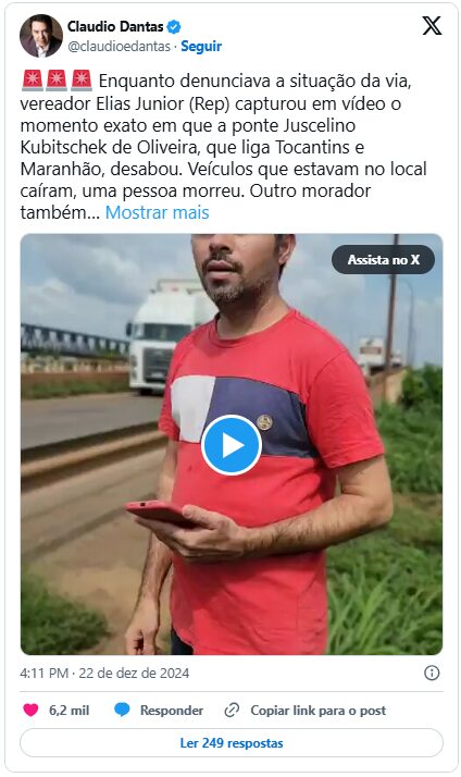 “Mergulhadores de Palmas foram acionados para ir e troquei mensagem com o ministro dos Transportes, que vai decretar estado de emergência para reparação da ponte. Temos que cuidar, agora, das pessoas e das vítimas que caíram nesse terrível acidente”, acrescentou.