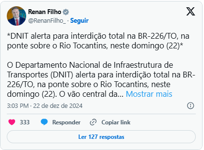 Pelo seu perfil oficial no Twitter/X, o ministro dos Transportes, Renan Filho, anunciou a “interdição total” da BR-226 na área do Tocantins. O comunicado foi publicado neste domingo.
