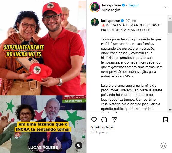 As redes sociais da cientista política Maria da Penha Lopes dos Santos são fechadas. Porém, a reportagem teve acesso a capturas de tela de algumas de suas publicações, que confirmam o apoio da atual superintendente do Incra-ES ao presidente Lula e seu vínculo com o MST.