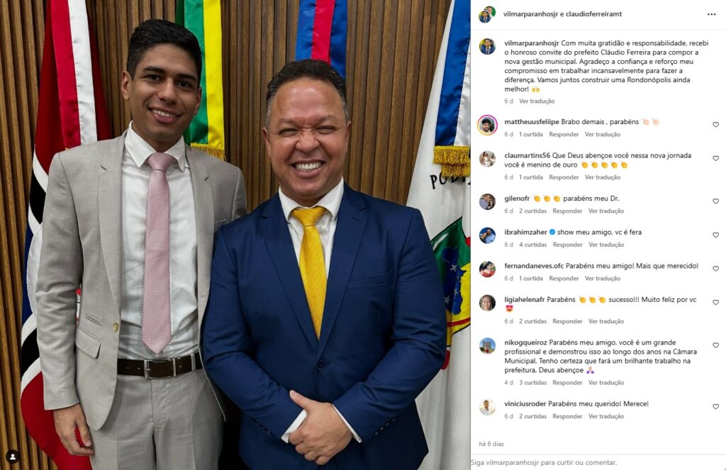 A escolha do prefeito eleito de Rondonópolis (MT), Cláudio Ferreira (PL), para compor sua equipe de governo já começou a gerar controvérsias antes mesmo de assumir o cargo. O advogado Vilmar Paranhos Júnior, ex-secretário de Finanças da Câmara Municipal e figura próxima ao atual presidente da Casa, Júnior Mendonça (PT), é o nome cotado para assumir o posto de secretário-adjunto de Governo a partir de janeiro de 2025.