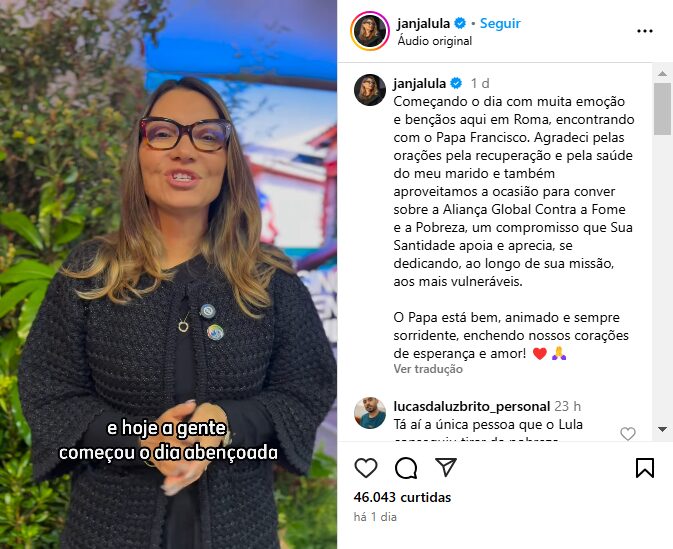 Em suas redes sociais, Janja compartilhou sua emoção ao encontrar o pontífice. “Hoje a gente começou o dia abençoada, encontrando com o papa Francisco”, afirmou Janja. “Eu estou muito emocionada, toda vez que eu encontro com ele é sempre uma emoção.”