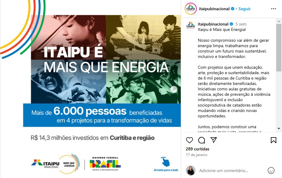 Em 2024, Itaipu destinou US$ 450 milhões (R$ 2,5 bilhões) a essas iniciativas.