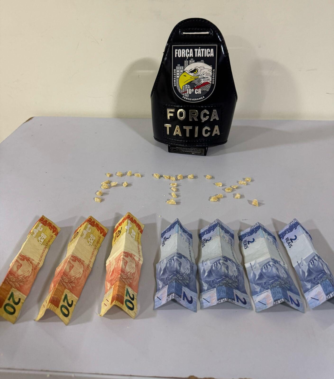 No local onde o objeto foi arremessado, os policiais realizaram uma varredura e localizaram uma caixa contendo 29 porções de substância análoga à pasta base de cocaína, além de R$ 68,00 em notas trocadas, possivelmente oriundas do tráfico.
