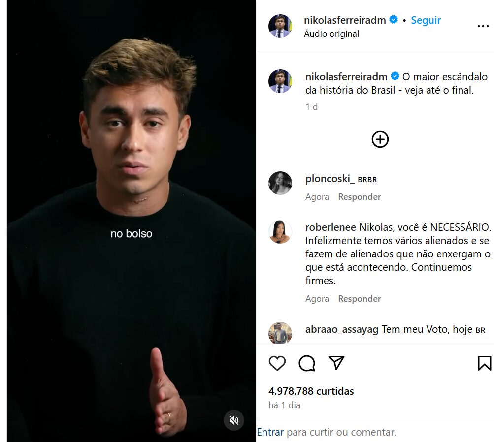 Publicado na tarde da terça-feira, 6, o vídeo já conta com mais de 110 milhões de visualizações no Instagram. No vídeo, o deputado critica a gestão do governo Lula diante das acusações e destaca a nomeação de Lupi como ministro da Previdência, que renunciou ao cargo no começo de maio.