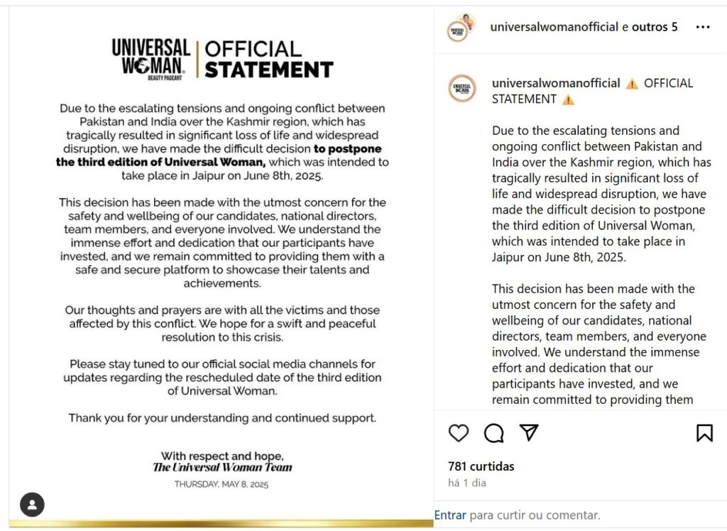 A intensificação do conflito entre Índia e Paquistão na região da Caxemira forçou o adiamento do concurso internacional de beleza Universal Woman, cuja terceira edição estava prevista para ocorrer em 8 de junho, na cidade de Jaipur, Índia.