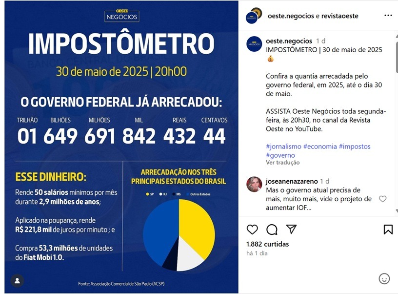 O governo federal ultrapassou a marca de R$ 1,6 trilhão de impostos arrecadados no ano de 2025. Os dados são do Impostômetro, da Associação Comercial de São Paulo (ACSP), colhidos nesta sexta-feira, 30.