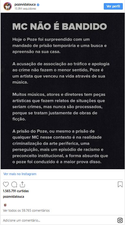 “Se preso por relação com crime organizado, por óbvio, foi bem preso. Mas uma coisa tem que ficar clara: não existe apologia a crime em letra de música. Letra, por pior que seja, é obra ficcional, e ficção não é apologia. Apologia é destinar ao outro mensagem com intenção deliberada de o fazer cometer crime. Não significa falar de crime, não significa romantizar crime. Quem aceita que letra é apologia tem de aceitar que piada é misoginia e racismo, a lógica é a mesma.”