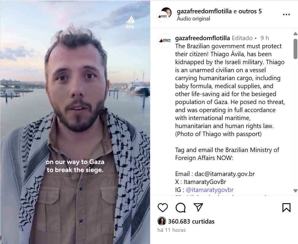 “Ao recordar o princípio da liberdade de navegação em águas internacionais, o Brasil insta o governo israelense a libertar os tripulantes detidos”, escreveu o Itamaraty. “Sublinha, ademais, a necessidade de que Israel remova imediatamente todas as restrições à entrada de ajuda humanitária em território palestino, de acordo com suas obrigações como potência ocupante. As Embaixadas na região estão sob alerta para, caso necessário, prestar a assistência consular cabível, em consonância com a Convenção de Viena sobre Relações Consulares.”