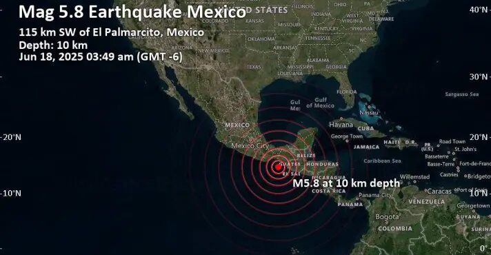 Um terremoto de magnitude 5,8 sacudiu nesta quarta-feira, 18, a região costeira do Estado de Chiapas, no sul do México. O Serviço Geológico dos Estados Unidos confirmou a informação e registrou o epicentro a 189 quilômetros da cidade de Tapachula e a 10 quilômetros de profundidade.