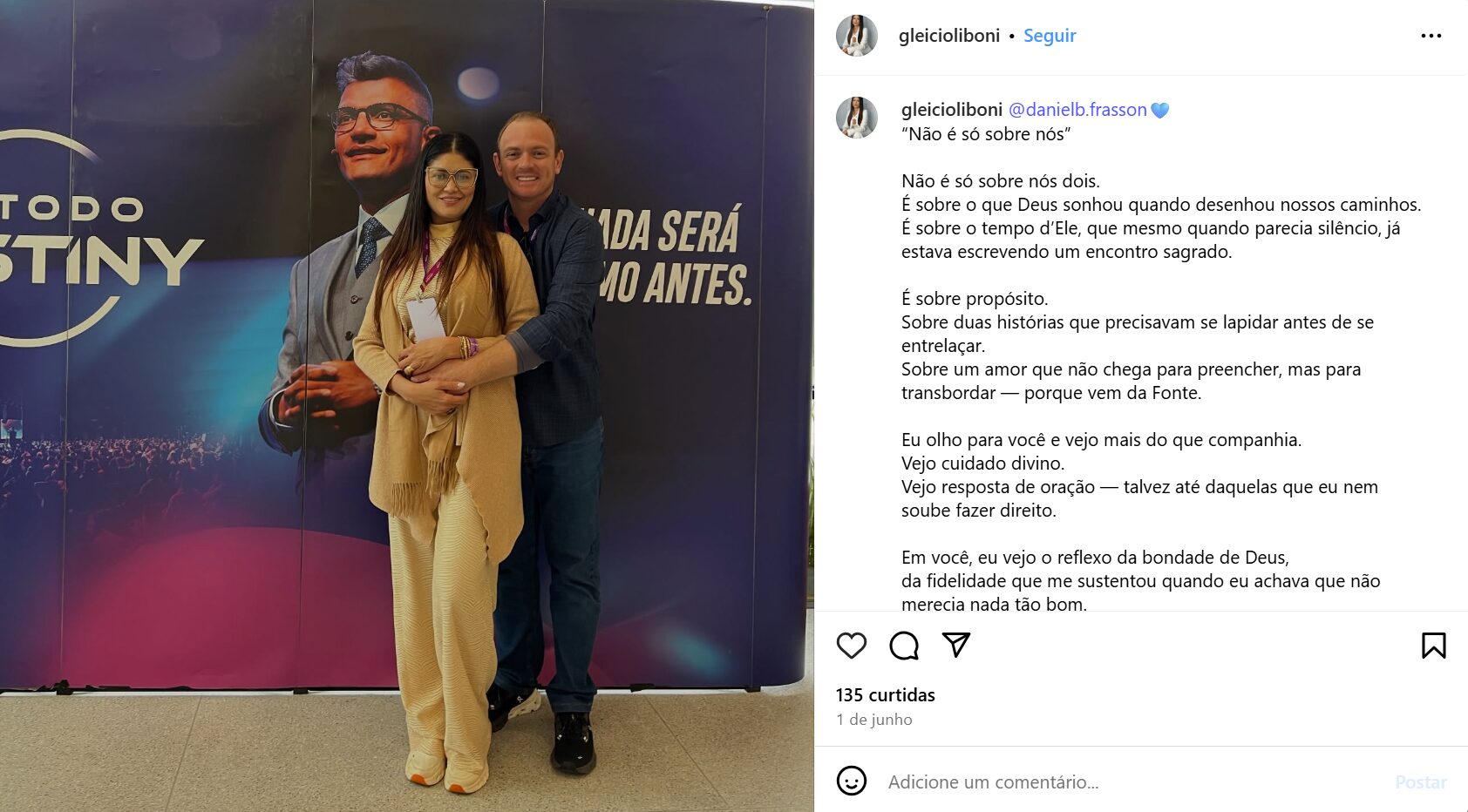 No perfil, voltado também à atividade profissional que exercia, ela exaltava o relacionamento dos dois. “Em você, eu vejo o reflexo da bondade de Deus, da fidelidade que me sustentou quando eu achava que não merecia nada tão bom. Você é um presente que veio no tempo exato, com o peso leve da promessa cumprida. E eu sou imensamente grata. Grata por você existir. Grata por te ter”, diz trecho da publicação.