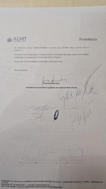 “Referido documento, de natureza sigilosa e ainda sob apuração no âmbito do Ministério Público de Mato Grosso e do Poder Judiciário, passou a circular de forma indevida em canais não oficiais, acarretando a exposição de parlamentares e colocando em risco o devido processo legal, o direito a ampla defesa e o equilíbrio institucional entre os Poderes. Tal situação reveste-se de gravidade, uma vez que compromete a credibilidade das investigações em curso e pode configurar violação a normas legais relativas à proteção de informações sigilosas no âmbito da segurança pública e da administração da Justiça”, diz o documento da ALMT.