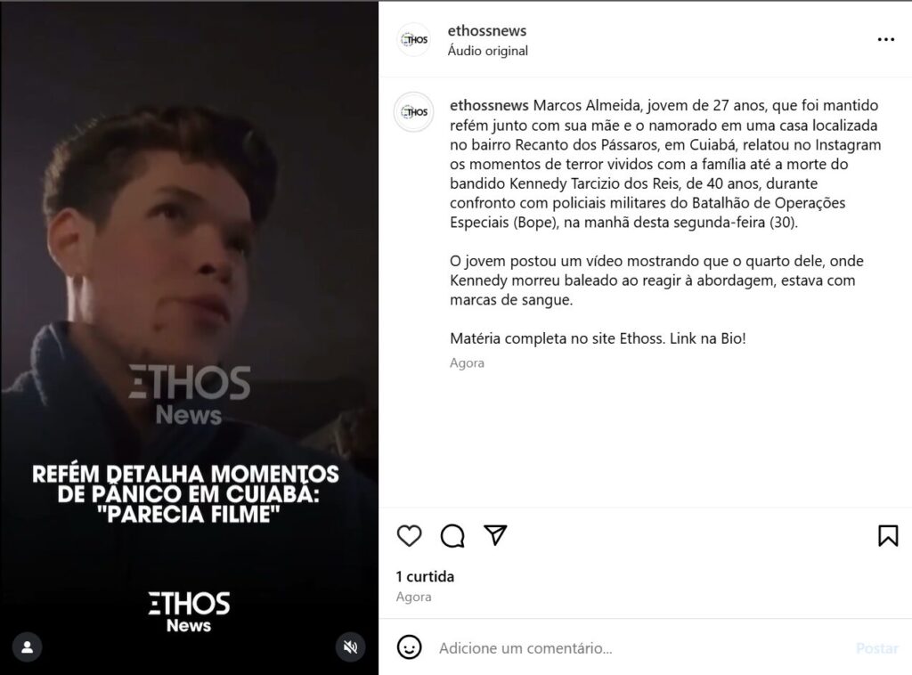 Marcos Almeida, jovem de 27 anos, que foi mantido refém junto com sua mãe e o namorado em uma casa localizada no bairro Recanto dos Pássaros, em Cuiabá, relatou no Instagram os momentos de terror vividos com a família até a morte do bandido Kennedy Tarcizio dos Reis, de 40 anos, durante confronto com policiais militares do Batalhão de Operações Especiais (Bope), na manhã desta segunda-feira (30). O jovem postou um vídeo mostrando que o quarto dele, onde Kennedy morreu baleado ao reagir à abordagem, estava com marcas de sangue.