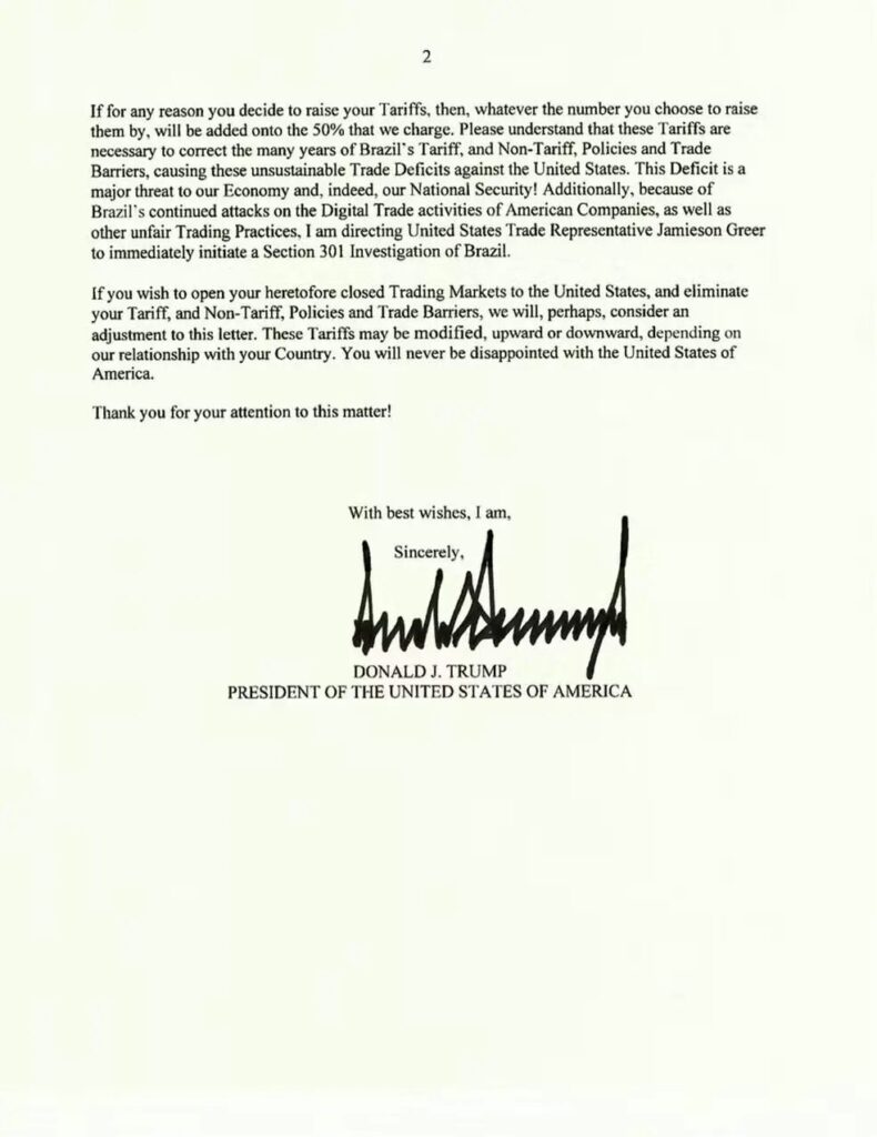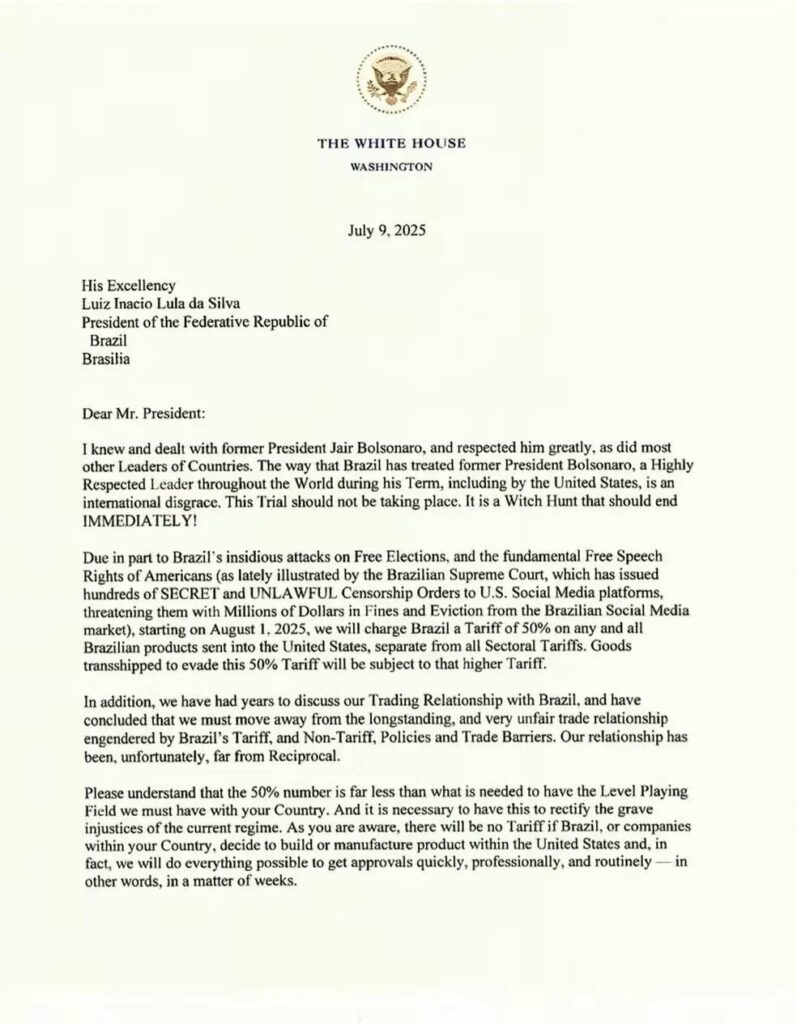 Trump também mencionou práticas comerciais brasileiras injustas. Outro motivo para taxar o Brasil, que não foi expresso na carta, seria a proximidade do governo brasileiro com o Brics, que tenta se sustentar como um bloco comercial e político de oposição aos EUA.