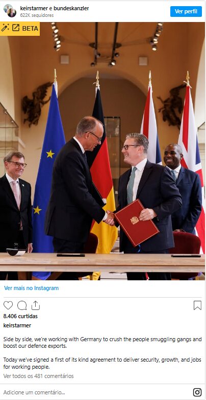 Starmer, nesta quinta, esteve ao lado do primeiro-ministro alemão, Friedrich Merz, na assinatura do tratado entre os dois países. O acordo estabelece cooperação em defesa convencional, tecnologia militar, migração e infraestrutura.