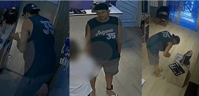 Segundo as imagens, o suspeito — de boné, camiseta azul com a inscrição “Arizona”, chinelo branco e com o corpo coberto por tatuagens — entrou na loja se passando por cliente. Ele foi atendido com educação pela proprietária e fingiu interesse nas peças, enquanto aproveitava os momentos de distração da vendedora para esconder os produtos no bolso do short.