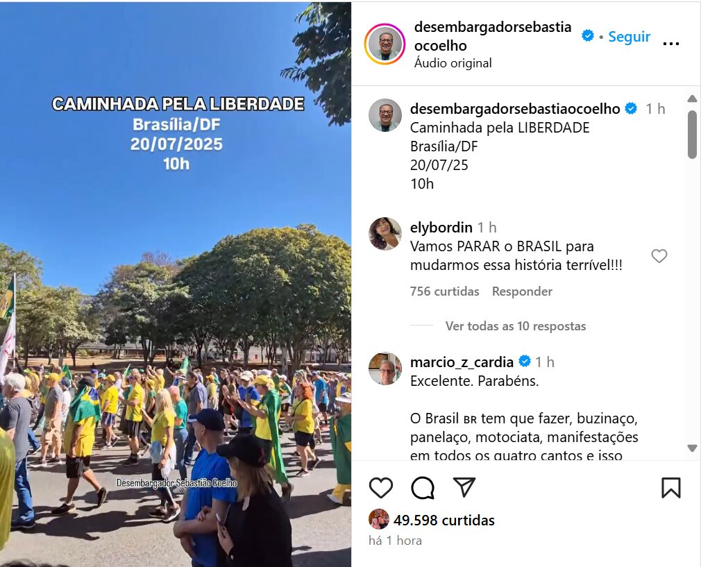 Pré-candidato do Novo ao Senado, o desembargador aposentado Sebastião Coelho também prestigiou a manifestação. Coelho defendeu “a libertação dos brasileiros contra a tirania”.