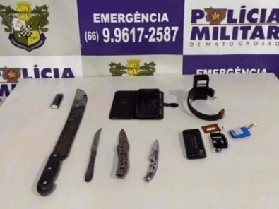 Na busca, os policiais encontraram dois canivetes, um deles ensanguentado, e uma faca de mesa no chão. O suspeito estava com várias escoriações da luta. Ele usa tornozeleira eletrônica e tentou danificar o aparelho durante o registro do boletim.