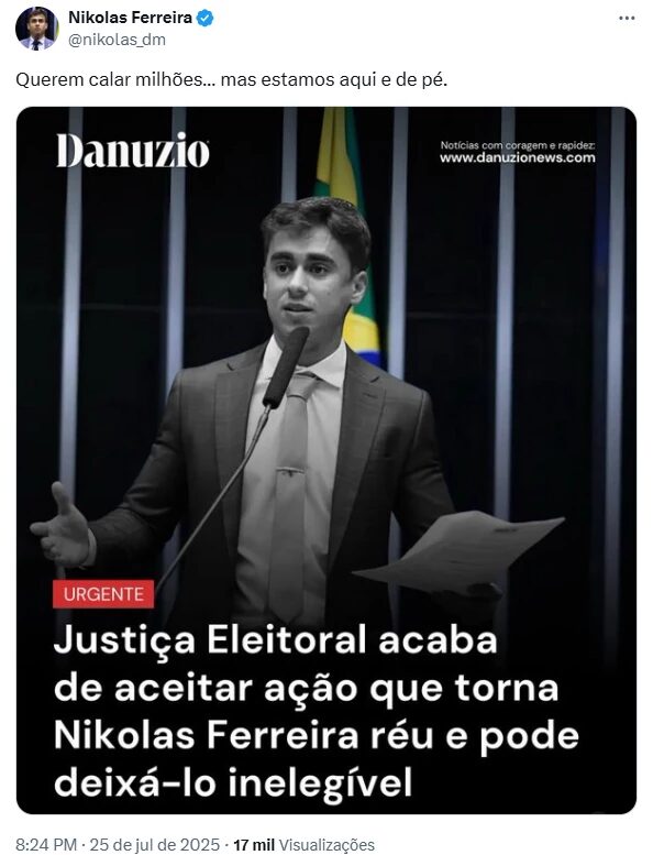 Nas redes sociais, na noite desta sexta-feira, Nikolas Ferreira comentou o caso de maneira sucinta.