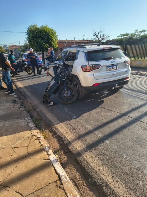 Imagens divulgadas pela Guarda Municipal de Várzea Grande mostram que uma motocicleta, literalmente, ficou pendurada na janela da porta traseira de um Jeep Compass na manhã desta sexta-feira (1º de agosto). A roda dianteira ainda aparece parcialmente dentro do SUV.