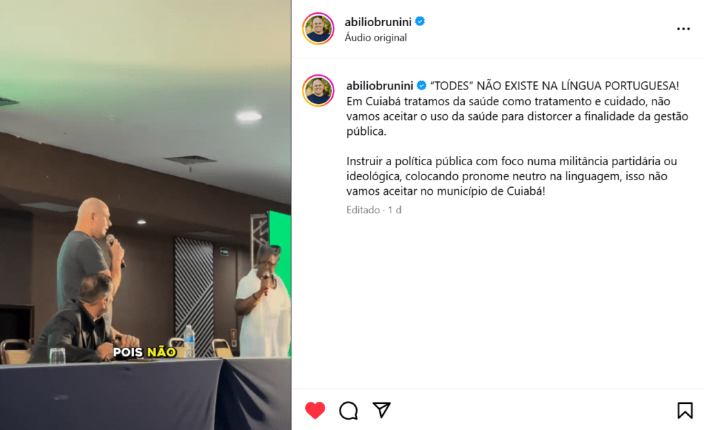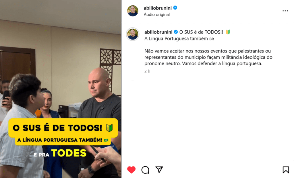 “Durante a minha gestão, não trabalho com pronome neutro, nem doutrinação ideológica”, afirmou o prefeito. Ele disse que, se a apresentação não fosse ajustada conforme as diretrizes linguísticas e técnicas municipais, suspenderia o discurso da palestrante.