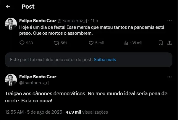 Na visão do advogado, o político do Partido Liberal deveria ser executado, sob “pena de morte”, modalidade que não tem previsão no Código Penal brasileiro. “Hoje é um dia de festa!”, escreveu Santa Cruz, em seu perfil oficial no X, já na madrugada desta terça-feira, 5.