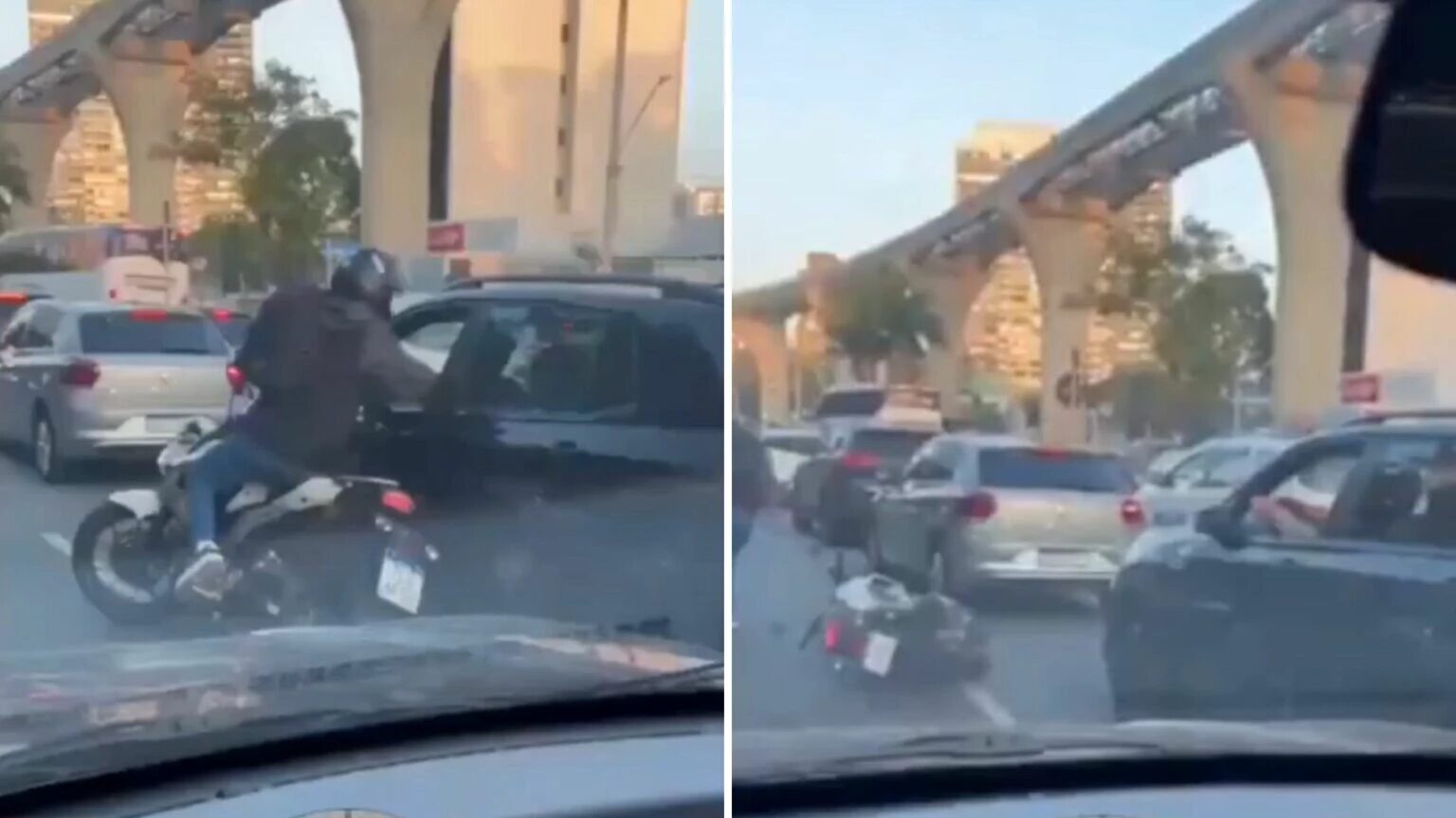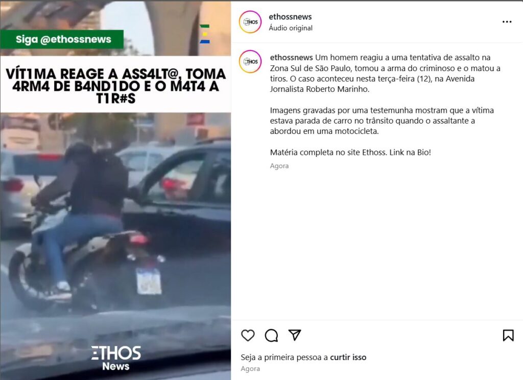 Imagens gravadas por uma testemunha mostram que a vítima estava parada de carro no trânsito quando o assaltante a abordou em uma motocicleta. O condutor do carro decidiu reagir e conseguiu tomar a arma das mãos do bandido, efetuando os disparos a queima roupa ao menos três vezes, logo em seguida.