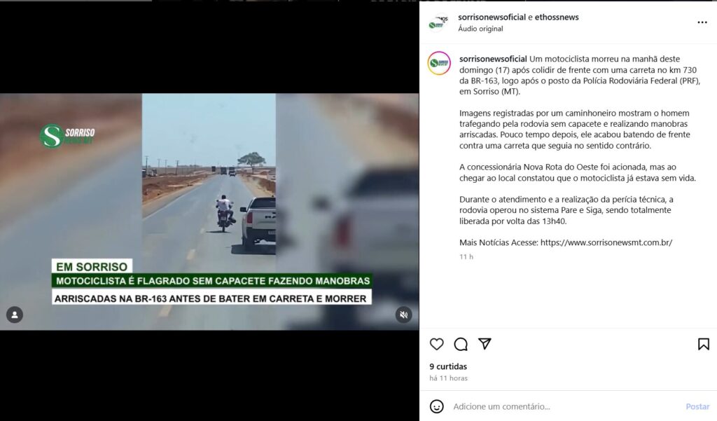 No vídeo é possível ver o piloto trafegando sem o capacete e levantando as mãos, além de invadir a pista contrária em diferentes momentos da gravação. De acordo com informações preliminares, a carreta Volvo FH seguia em direção a Lucas do Rio Verde quando o motociclista, que conduzia uma Honda CG Titan preta, tentou realizar uma ultrapassagem. Com a força da batida, o homem foi arremessado para fora do veículo.