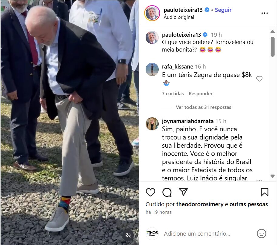 Em meio ao evento em Sorocaba — além de ostentar a peça de grife —, Lula provocou seu antecessor, Jair Bolsonaro, com uma insinuação. O petista disse que “tem gente que tem tornozeleira, eu tenho meio bonita”. Paulo Teixeira, ministro do Desenvolvimento Agrário, divulgou o momento em sua conta no Instagram.