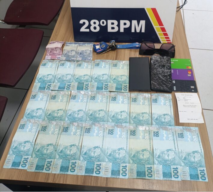 A segunda suspeita, N.B.S., passou por revista pessoal. Inicialmente, negou ter realizado qualquer saque, mas durante uma busca mais detalhada feita por uma policial feminina, foi encontrado o valor de R$ 2.000,00 escondido em sua vestimenta, próximo às partes íntimas. Além do dinheiro, foram apreendidos um cartão de débito do Sicredi em nome de D.A.S. e um cartão da instituição Mercado Pago, também em nome de terceiros. Questionada, a suspeita admitiu ter sacado a quantia da conta de D.A.S.