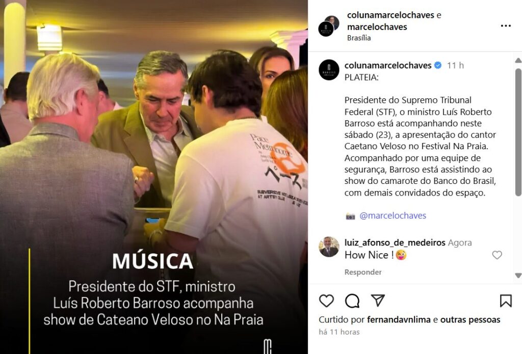 O presidente do Supremo Tribunal Federal (STF), Luís Roberto Barroso, foi ao show do cantor Caetano Veloso na noite deste sábado, 23, em Brasília. Segundo o Jornal de Brasília, o magistrado estava acompanhado por seguranças no camarote do Banco do Brasil. A apresentação faz parte da programação do Na Praia Festival.