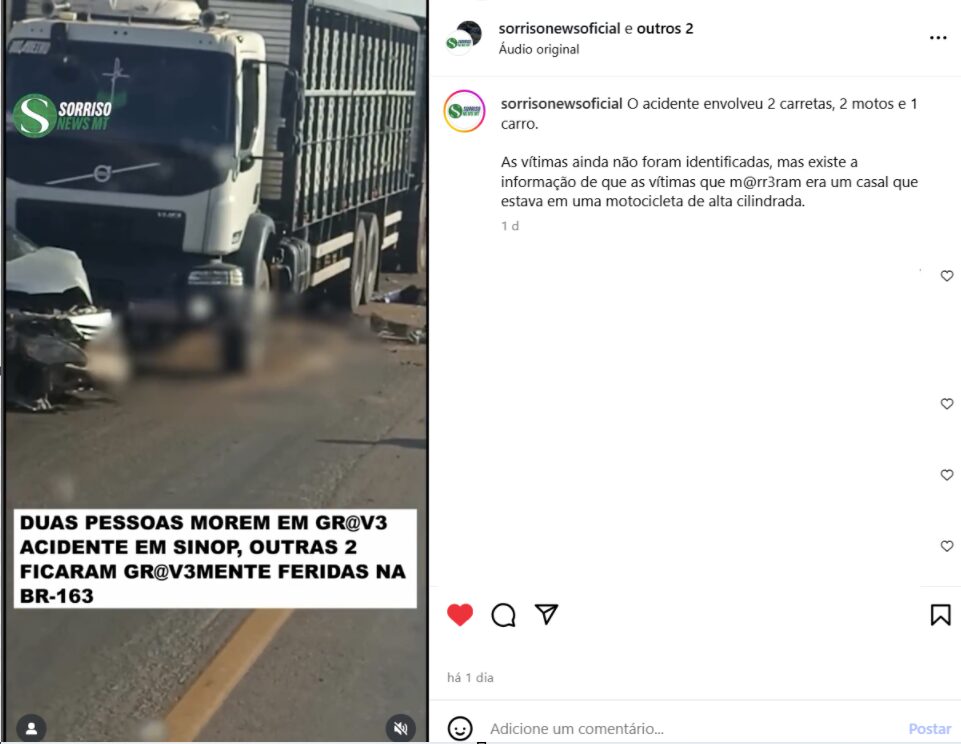 O Corpo de Bombeiros Militar de Mato Grosso (CBMMT) atuou, nesta segunda-feira (25), em um acidente de trânsito envolvendo duas carretas, um Corolla de cor prata e duas motocicletas, no quilômetro 845 da BR-163, no município de Sinop (500 km de Cuiabá). Morreram no acidente o casal Cristiane Kaiser Munhoz e Paulo André Munhoz. Ambos eram moradores de Cáceres (225 km da Capital) onde atuavam como empresários e faziam parte do Fronteira Motoclube.