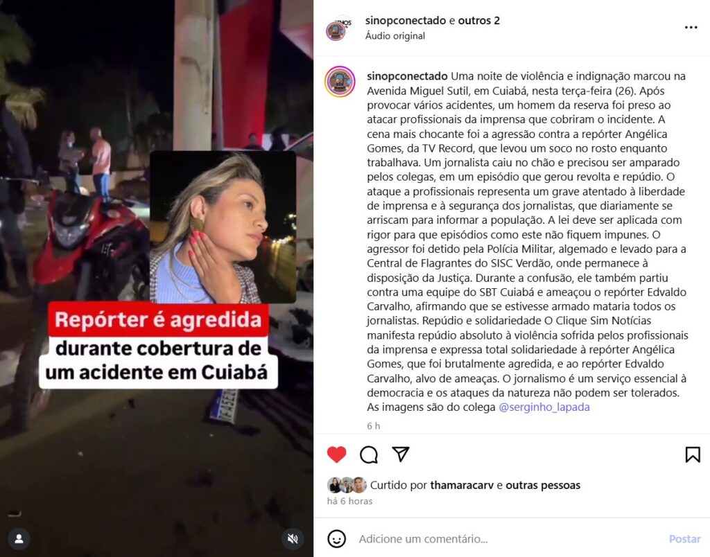 “Eu levei um murro no rosto de um policial militar aposentado que tinha provocado um acidente. Eu cheguei para gravar a matéria e estava relatando os fatos que foram me passados. Eu estava narrando a matéria, fazendo a minha passagem para a televisão e, nesse momento, ele se aproximou, bateu na câmera, jogou a câmera no chão e veio com um murro no meu rosto”, disse Angélica.