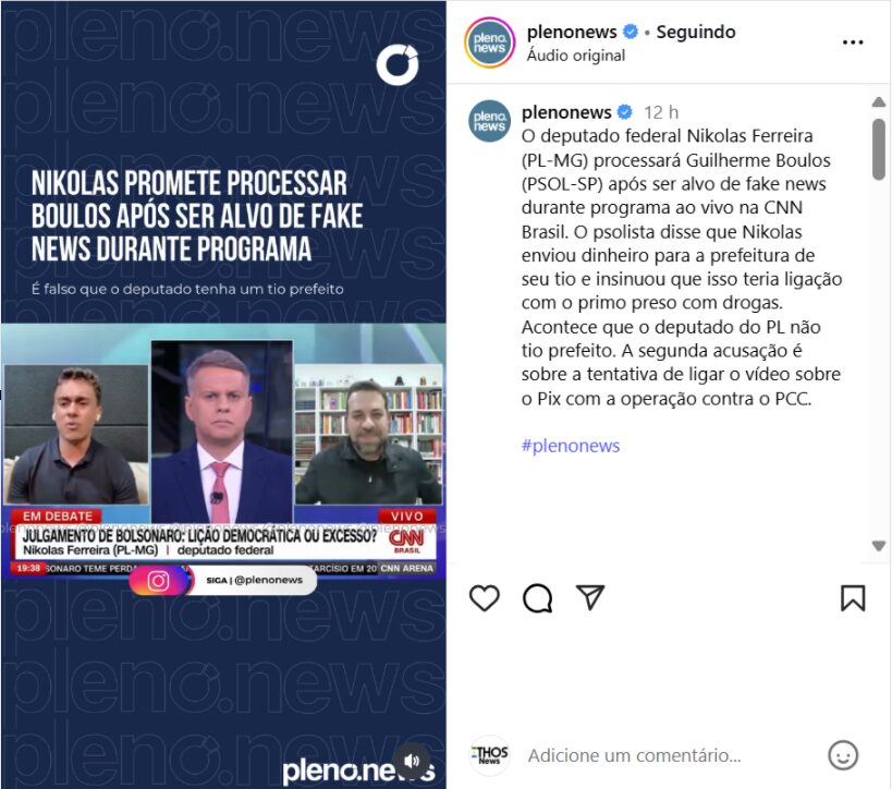 O deputado federal Nikolas Ferreira (PL-MG) afirmou nesta quinta-feira (28) que vai processar Guilherme Boulos (PSOL-SP) por declarações feitas durante programa ao vivo na CNN Brasil. O psolista disse que Nikolas teria enviado dinheiro para a prefeitura de um tio e sugeriu ligação com o primo preso por tráfico de drogas.