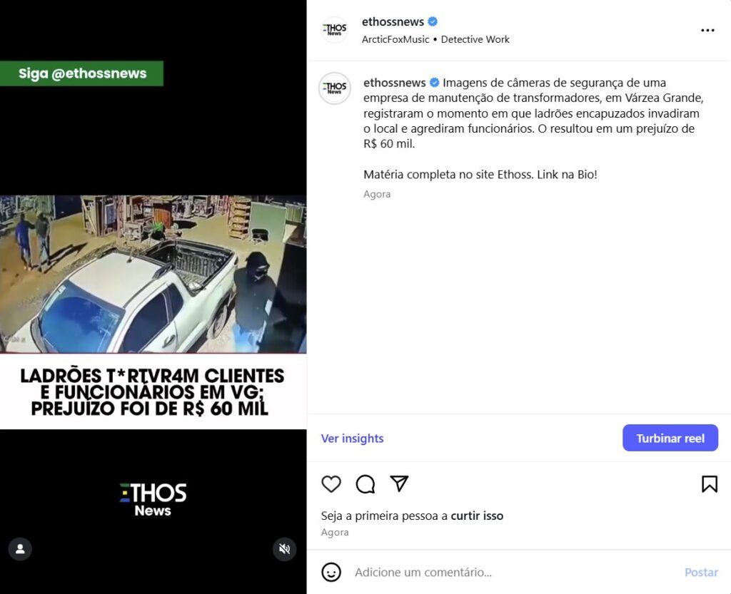 Imagens de câmeras de segurança de uma empresa de manutenção de transformadores, em Várzea Grande, registraram o momento em que ladrões encapuzados invadiram o local e agrediram funcionários. O resultou em um prejuízo de R$ 60 mil.