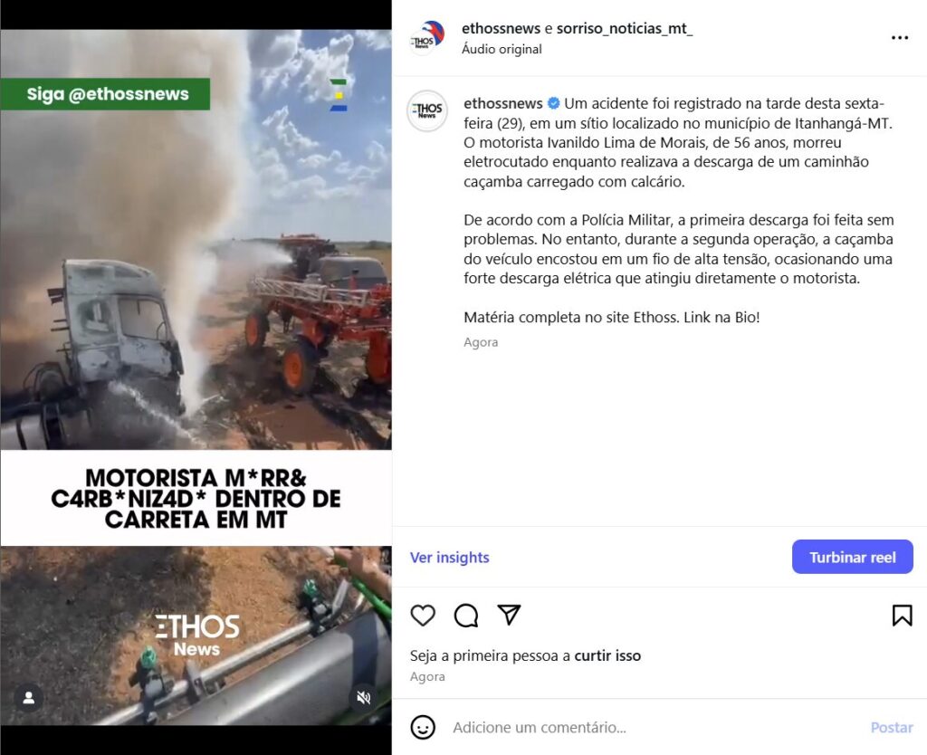 Após o choque, o caminhão ainda iniciou um princípio de incêndio. O caseiro da propriedade relatou que estava em horário de almoço quando ouviu um estrondo e percebeu que a energia havia sido interrompida. Ao sair para verificar, encontrou o veículo em chamas e o motorista caído ao lado. Ele ainda tentou socorrer a vítima, mas o corpo já havia sido parcialmente atingido pelo fogo.