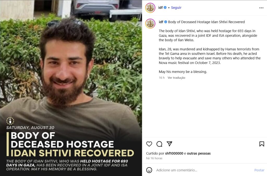 O governo israelense confirmou neste sábado, 30, a identificação do corpo de Idan Shtivi, de 28 anos, que havia sido levado por integrantes do Hamas durante o massacre de 7 de outubro de 2023. Ele foi morto no festival de música Nova, no deserto, e seus restos mortais foram retirados da Faixa de Gaza em uma operação conjunta das Forças de Defesa de Israel (FDI) e do serviço de segurança interna Shin Bet.