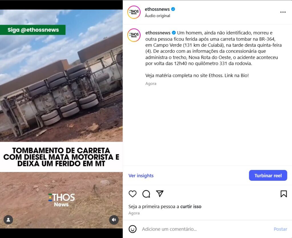 Um homem, ainda não identificado, morreu e outra pessoa ficou ferida após uma carreta tombar na BR-364, em Campo Verde (131 km de Cuiabá), na tarde desta quinta-feira (4). De acordo com as informações da concessionária que administra o trecho, Nova Rota do Oeste, o acidente aconteceu por volta das 12h40 no quilômetro 331 da rodovia.