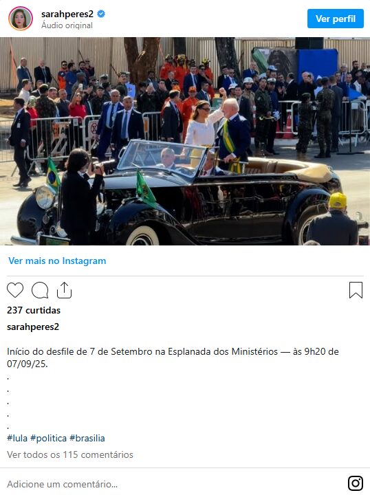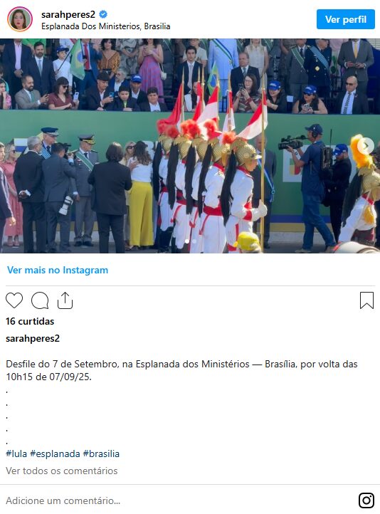 Depois de anunciado o fim do desfile na Esplanada, Lula e Janja saíram juntos para cumprimentar parte do público presente nas arquibancadas próximas ao palanque das autoridades.