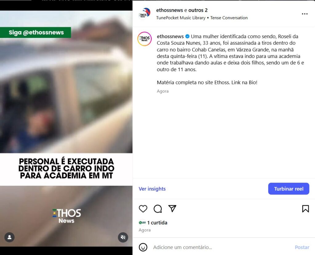Uma mulher identificada como sendo, Roseli da Costa Souza Nunes, 33 anos, foi assassinada a tiros dentro do carro no bairro Cohab Canelas, em Várzea Grande, na manhã desta quinta-feira (11). A vítima estava indo para uma academia onde trabalhava dando aulas e deixa dois filhos, sendo um de 6 e outro de 11 anos.