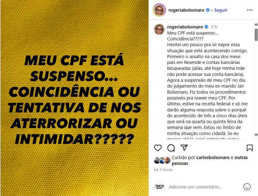 Neste domingo, 14, a ex-vereadora Rogéria Nantes, primeira mulher de Jair Bolsonaro, disse que teve o CPF suspenso.