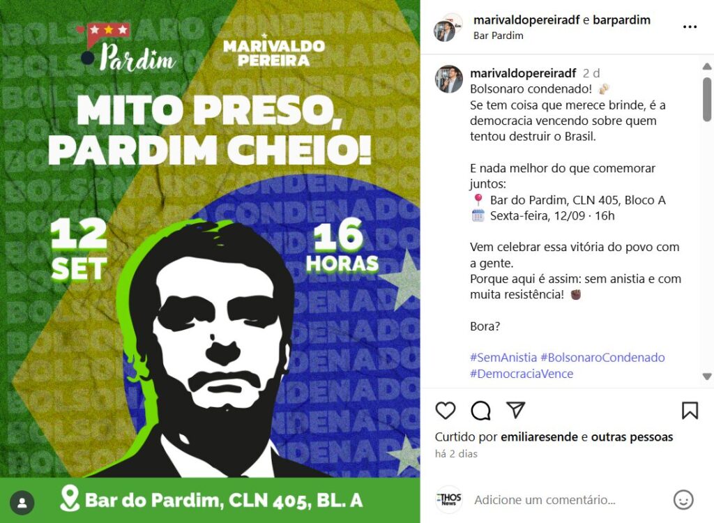 Em uma das mensagens no Instagram, Marivaldo destacou: “Bolsonaro condenado! Se tem coisa que merece brinde, é a democracia vencendo sobre quem tentou destruir o Brasil”. Ele também utilizou hashtags como “sem anistia”, “Bolsonaro condenado” e “democracia vence”.