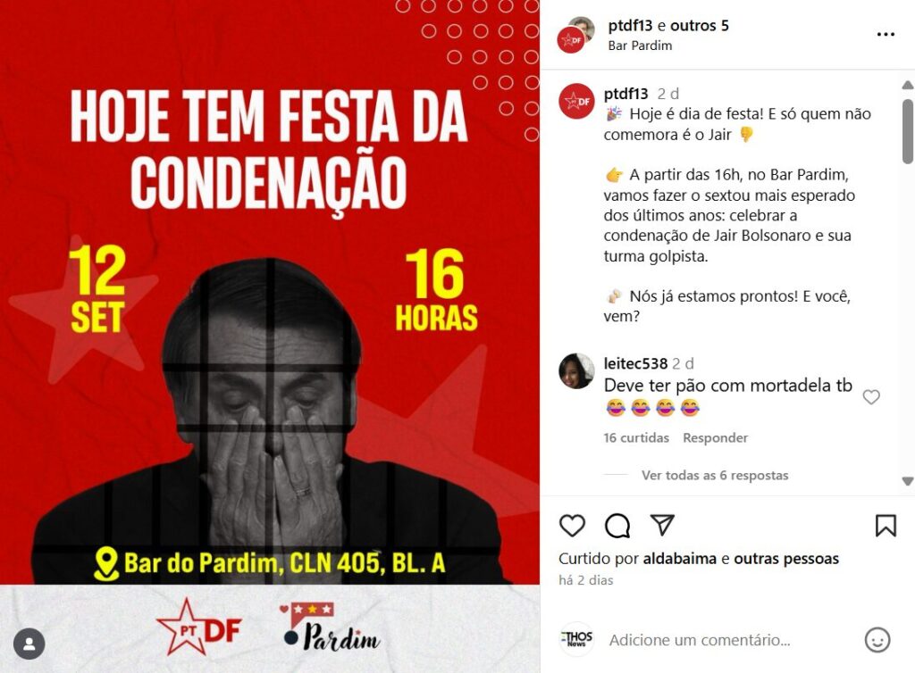 Em outra comunicação, feita em conjunto com o PT-DF, o secretário classificou o evento como “festa da condenação”, acrescentando: “Só quem não comemora é o Jair”.