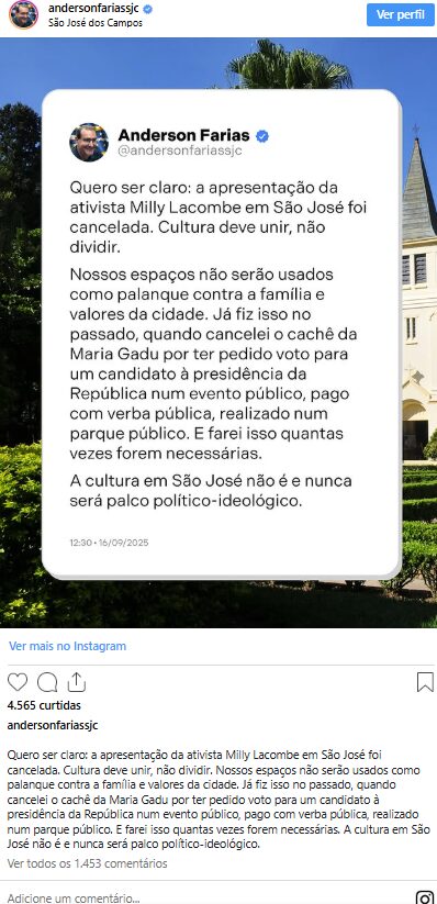 O prefeito Anderson Farias (PSD) barrou a participação da jornalista Milly Lacombe na edição deste ano da Festa Literomusical, em São José dos Campos (SP). O político anunciou a decisão nesta terça-feira, 16. O evento vai ocorrer na próxima sexta-feira, 19, no Parque Vicentina Aranha, região central da cidade.