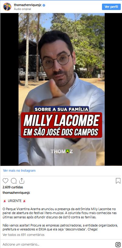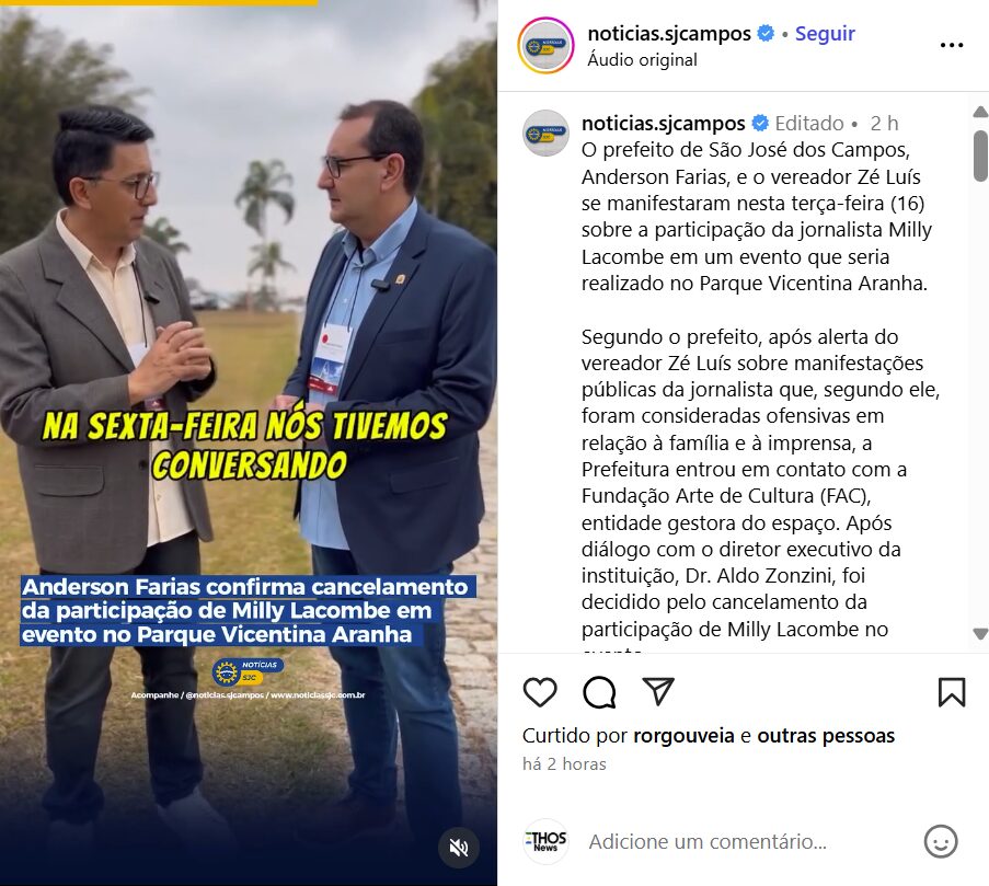 A assessoria do vereador encaminhou nota com o seguinte teor: “O setor público não pode, em hipótese alguma, apoiar discursos de ódio, especialmente aqueles que atacam a instituição da família. A fala da jornalista Milly Lacombe desumaniza famílias e pessoas, estigmatizando-as como fascistas e associando-as a comportamentos criminosos, como os praticados pelo regime fascista na Itália”.