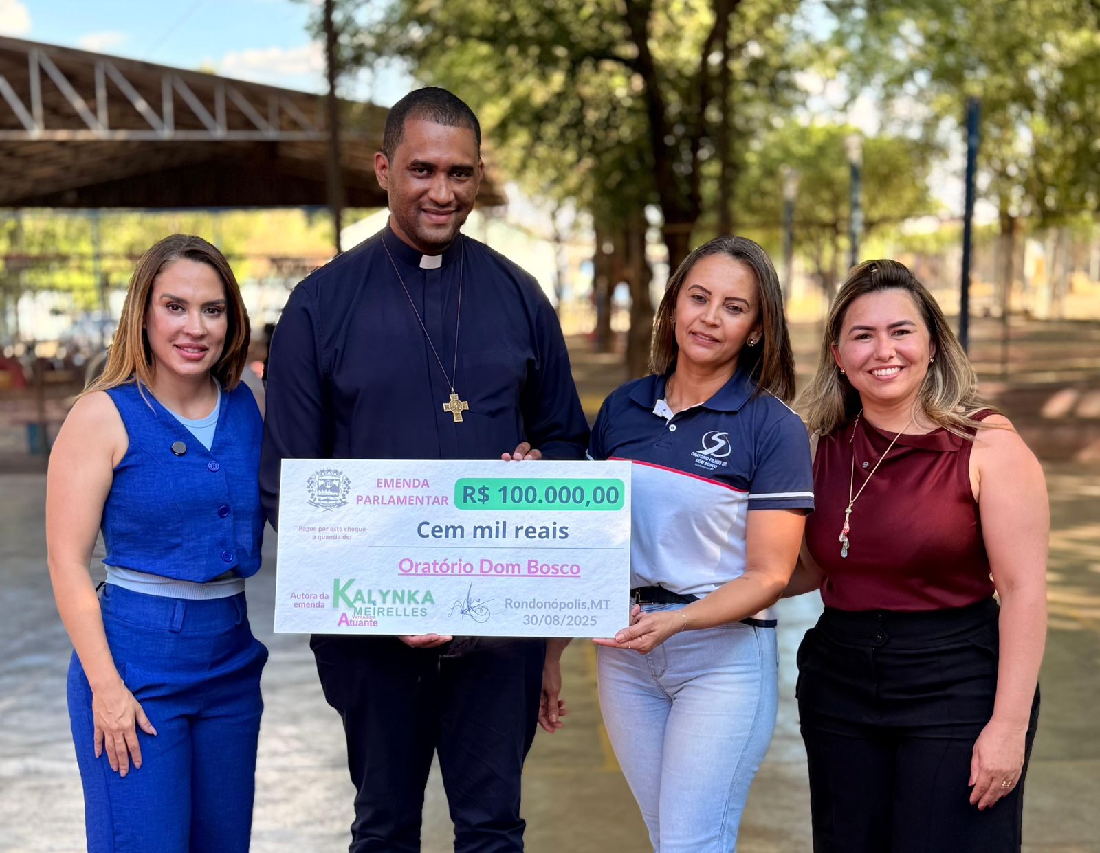 A vereadora Kalynka Meirelles entregou uma emenda parlamentar no valor de R$ 100 mil ao Oratório Dom Bosco, em Rondonópolis, instituição que atualmente acolhe e acompanha mais de 500 crianças e adolescentes. O recurso será utilizado para a compra de alimentos, garantindo a continuidade e o fortalecimento das ações de assistência e formação oferecidas pelo projeto.